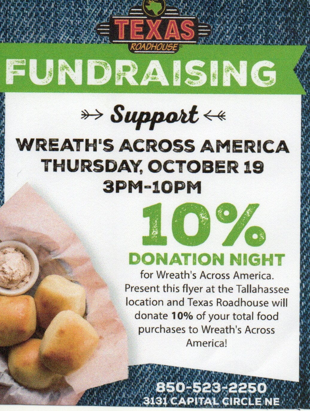 Our local Wreaths across America is holding a fundraiser on the 19th of October from 3PM-10PM. The holiday season is fast approaching and we still need around 2000 wreaths to cover each grave at the Tallahassee National Cemetery.