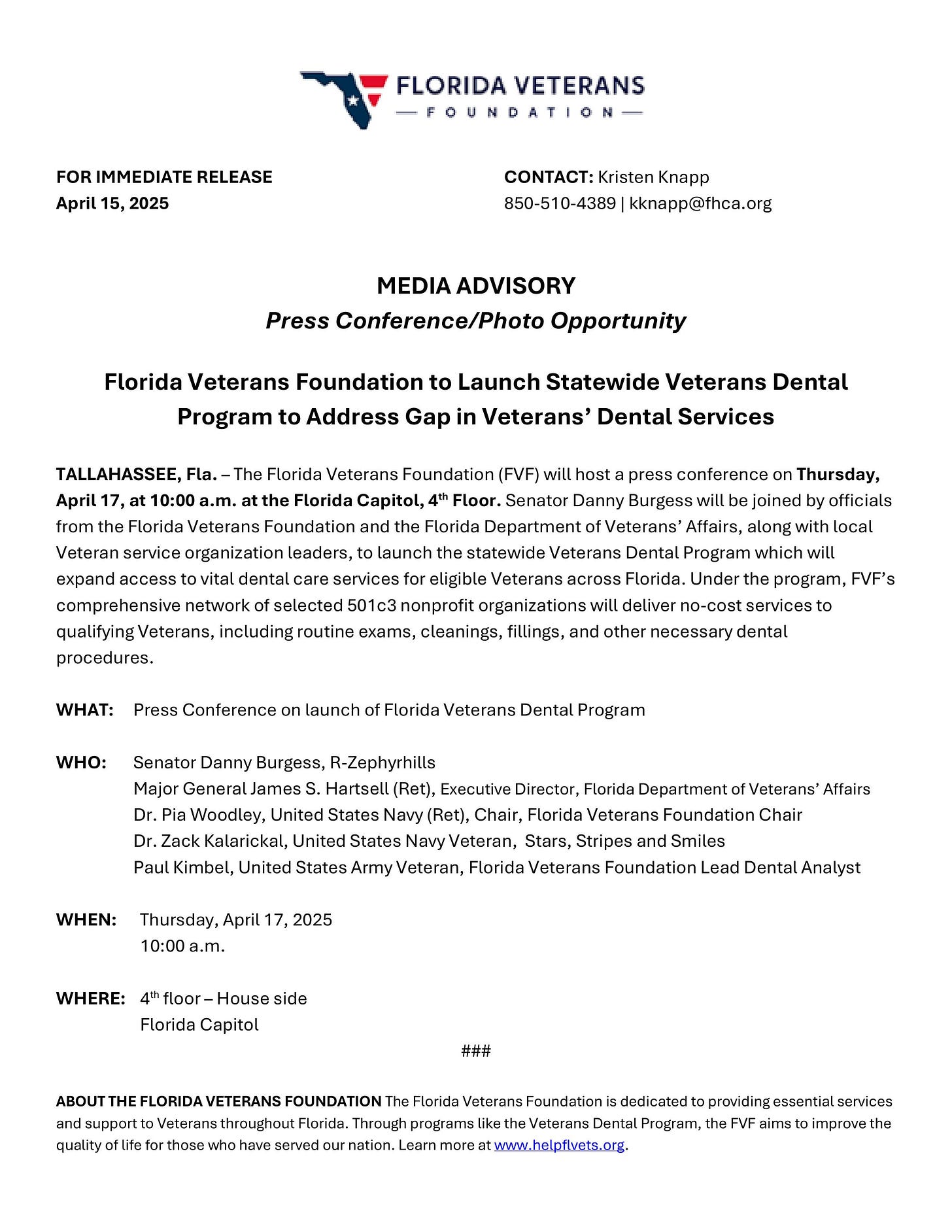 The Florida Veterans Foundation is excited to announce the Dental Program for Veterans. Join us on April 17th, 2025, at 10:00 AM at the Capitol for this special event. We would be honored to have Veterans from the Big Bend area with us to celebrate this unique program.