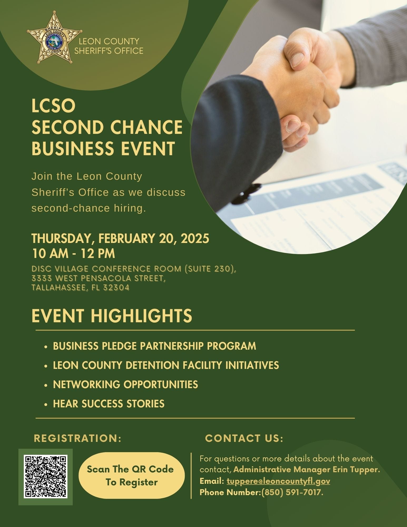 Attached to this email is a flyer for the February 20th Leon County Sheriffβs Office Second Chance Business Event. This event is to bring businesses together in the community to discuss successes and reasons to hire second chance individuals. Please do not hesitate to reach out with any questions.