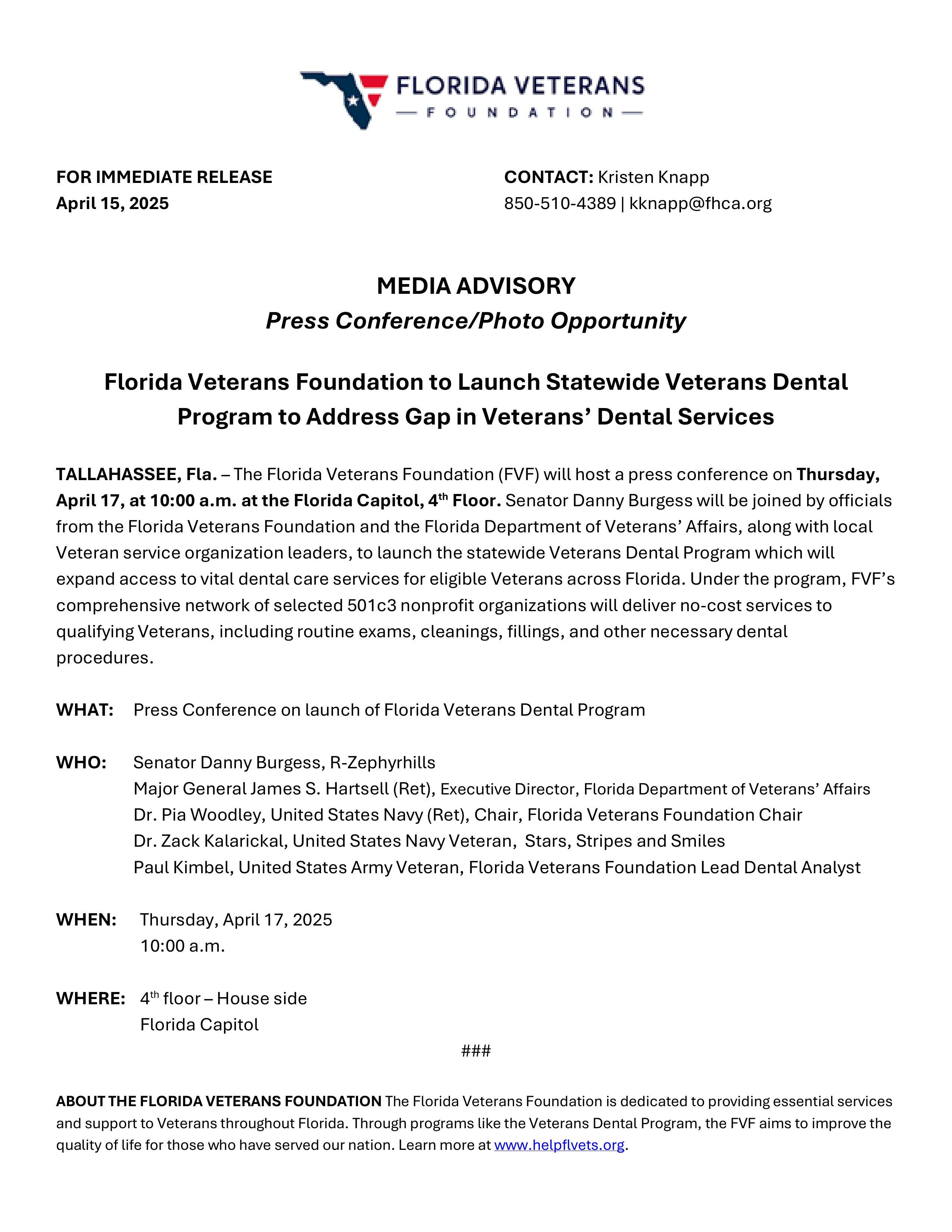 TALLAHASSEE, Fla. – The Florida Veterans Foundation (FVF) will host a press conference on Thursday, April 17, at 10:00 a.m. at the Florida Capitol, 4th Floor House side. Senator Danny Burgess will be joined by officials from the Florida Veterans Foundation and the Florida Department of Veterans’ Affairs, along with local Veteran service organization leaders, to launch the statewide Veterans Dental Program which will expand access to vital dental care services for eligible Veterans across Florida. Under the program, FVF’s comprehensive network of selected 501c3 nonprofit organizations will deliver no-cost services to qualifying Veterans, including routine exams, cleanings, fillings, and other necessary dental procedures.