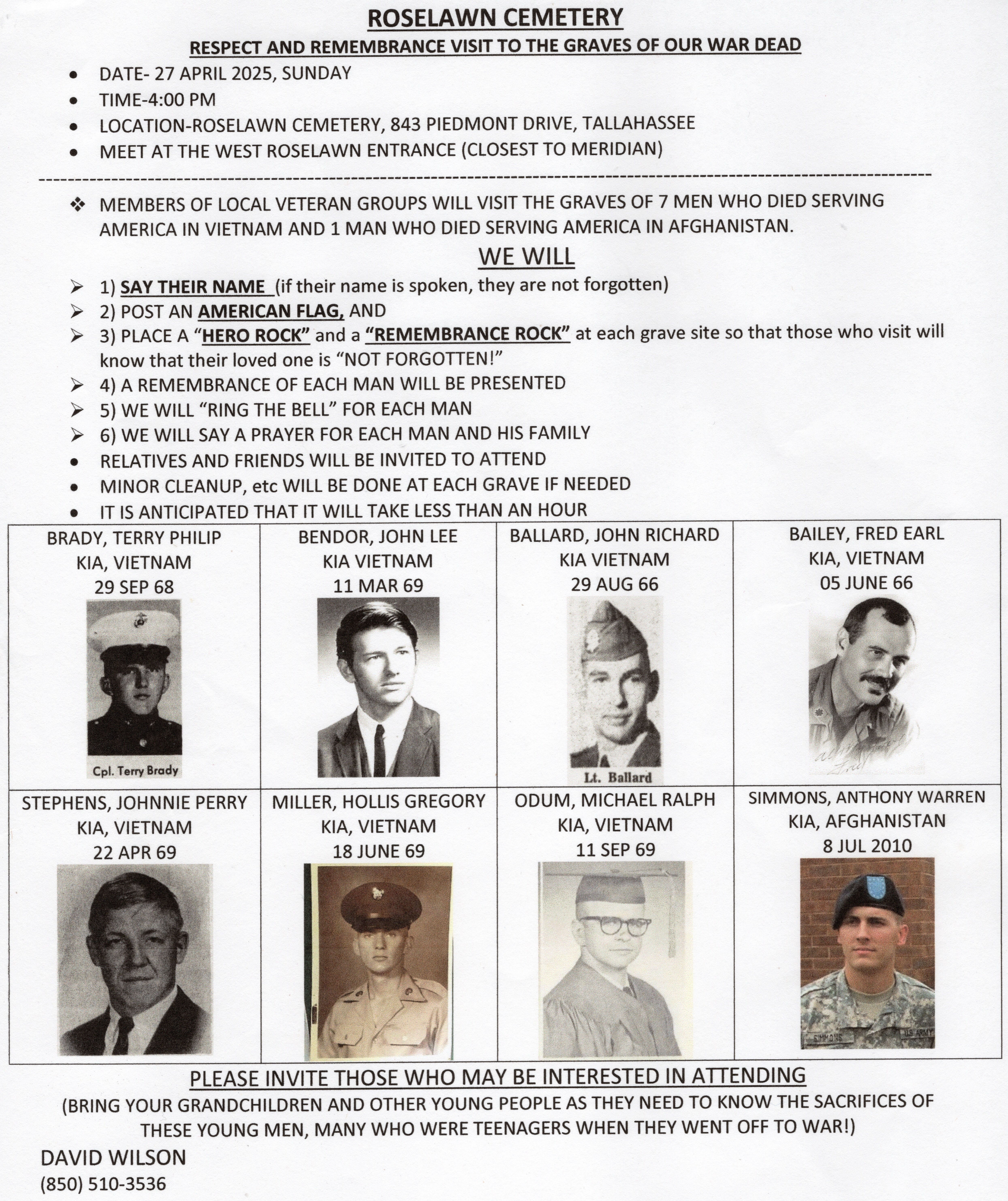 David Wilson, AmVets, Vet Events Tally, Air & Space Forces Association. He handed out flyers about the Visit to Roselawn Cemetery 843 Piedmont Drive, Tallahassee, FL. On Sunday, April 27 at 4 pm eight veterans who died serving America will be honored. Meet at West Roselawn Cemetery entrance (closest to Meridian). Usually lasts one hour; please bring children.