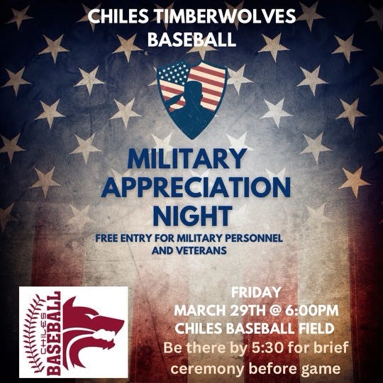Military Appreciation Night- Chiles Timberwolves Baseball ⚾📌 29 March 2024 6PMMajor John Haynes Outpost 1Mar 23, 2024∙ Paid1ShareThis post is for paid subscribersSubscribeAlready a paid subscriber? Sign inPreviousNext