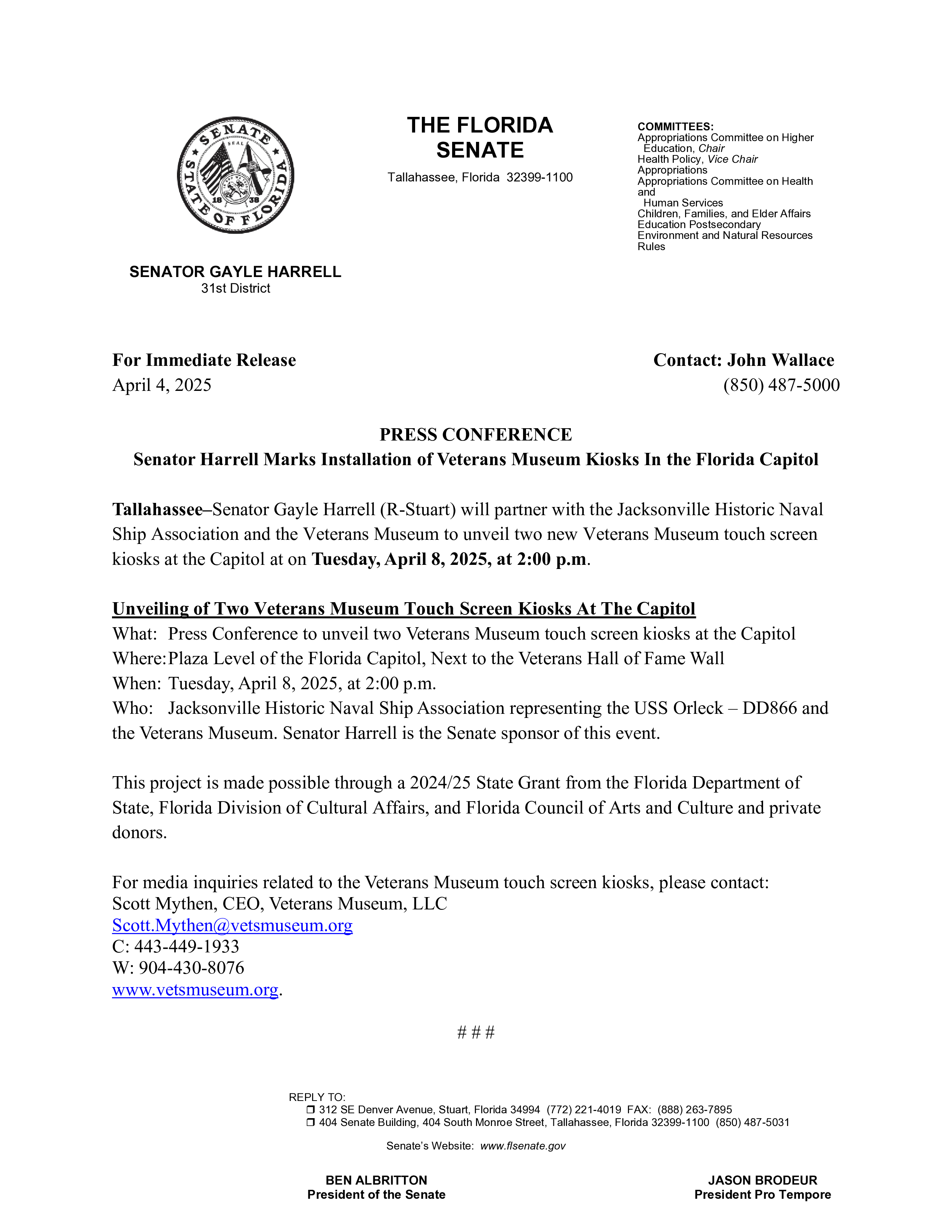 Senator Harrell Unveils Must-See Veterans Museum Kiosks at Florida State Capitol – Don’t Miss Out!📌 8 April 2025 2PMMajor John Haynes Outpost 1Apr 07, 2025SharePlease share the attached press release with your various groups.Greatly appreciated. Have a great weekend,Karen Sweeney-Senior Legislative Aide toSenator Gayle HarrellTallahassee Office: 850-487-5031District Office: 772-221-4019PreviousNext
