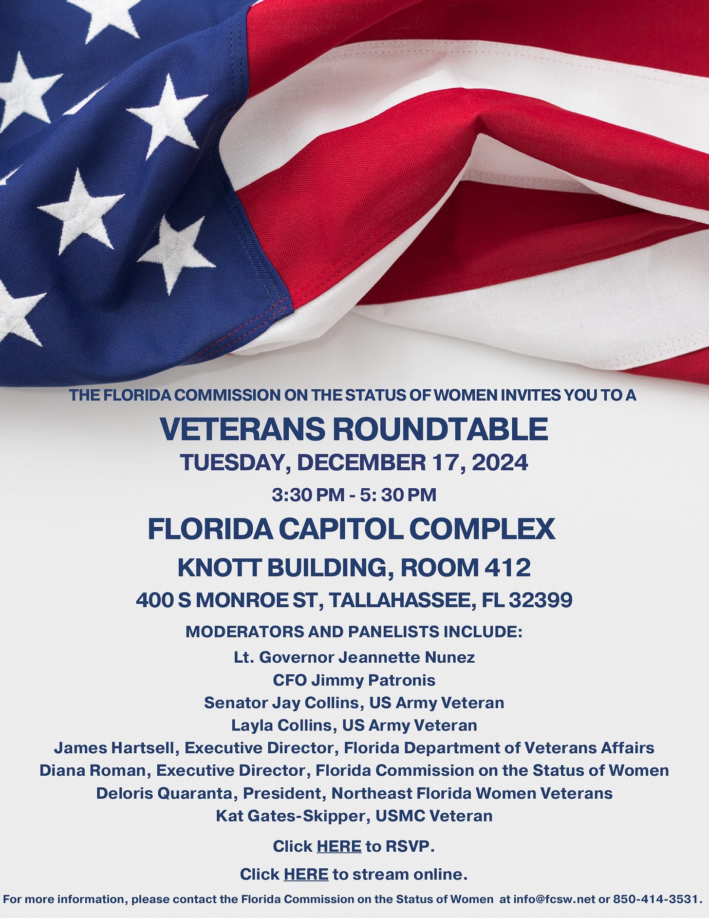 The Florida Commission on the Status of Women will be hosting a Veterans Roundtable next week, on Tuesday, December 17th at 3:30pm. This event will feature panels focused on: