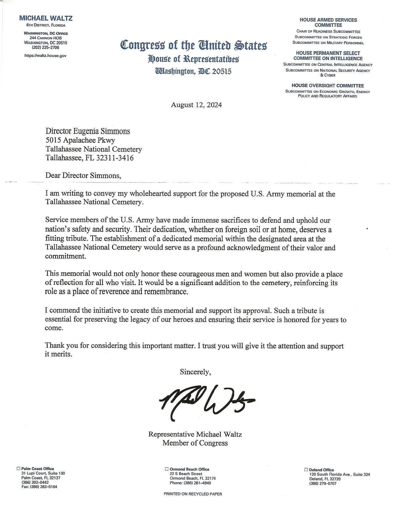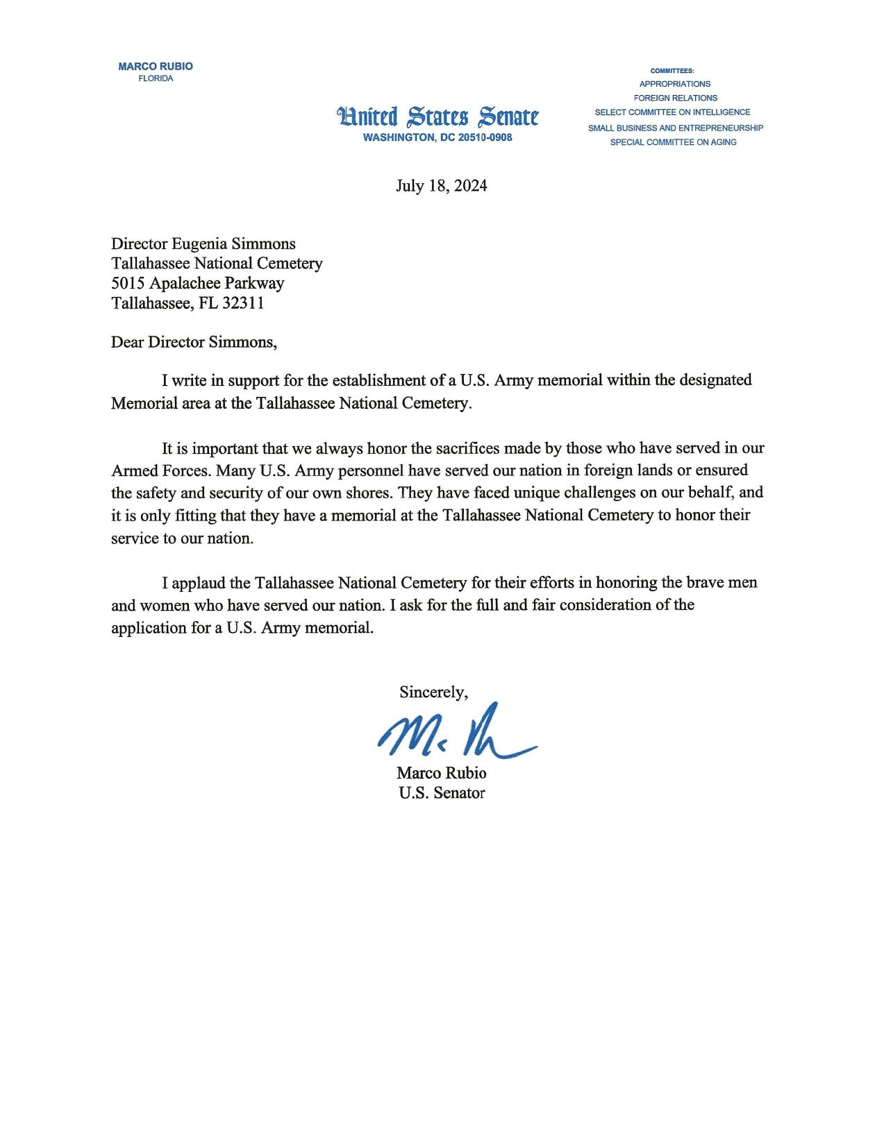 Marianne Trussell, Chair, Support Committee for the Tallahassee National Cemetery, Inc. Marianne thanked Lynn Diemer for her report on Wreaths Across America (WAA), and wreath pickup. The turnout was remarkable. The Final Salute Service is another story. It was advertised it, it was put on Facebook (FB), and people were contacted thru FB and email who appeared at the veteran’s service who had no family but made arrangements for himself. The result was non-existent for Final Salute held on December 18. Efforts will continue to increase attendance at Final Salute (held quarterly on the last Wednesday of the month at 3 pm) that honors veterans previously interred at the Tallahassee National Cemetery without military honors. Those veterans deserve your honor and your attendance. The next meeting of the Support Committee will be Tuesday, January 21, 2025, 5 pm at the Tallahassee National Cemetery Conference Room. The meeting lasts 1 hour and everyone is welcome.