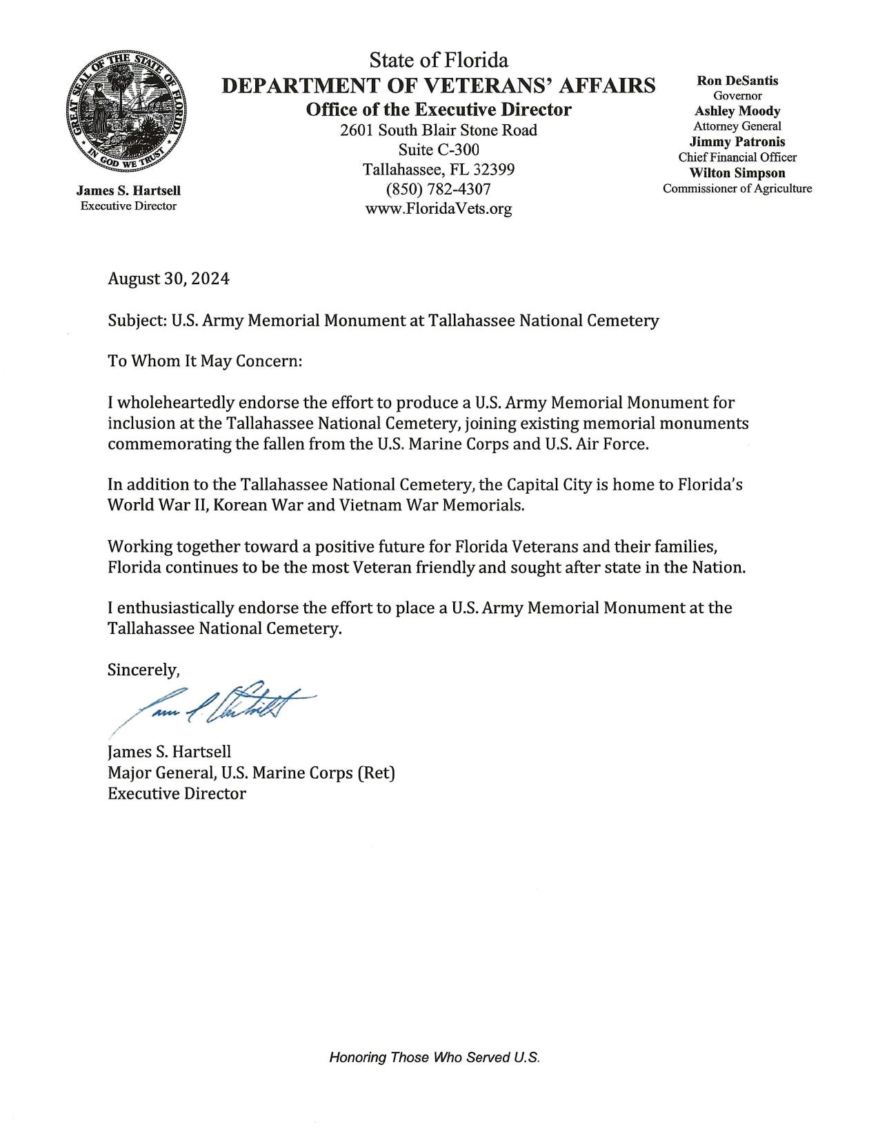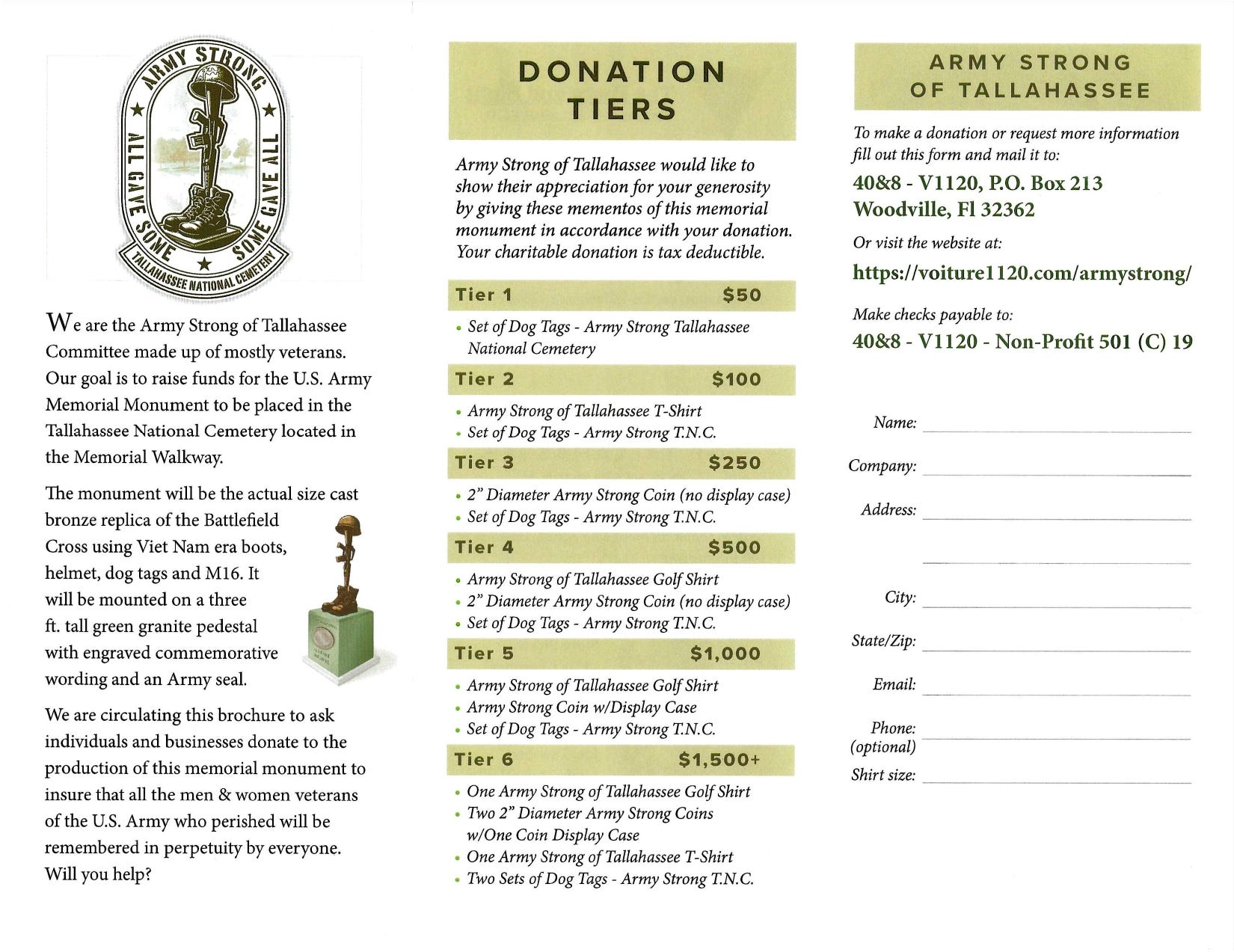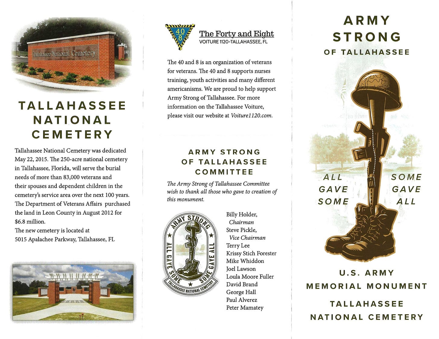 Billy Holder, Chairman, Army Strong of Tallahassee Committee. He submitted a notebook of paperwork to the Director of the National Cemetery for the building of a US Army monument at the Tallahassee National Cemetery. Five or six letters of support were included; the notebook will be forwarded to the VA in Atlanta and if approved from there to DC. DOD has approved the use of the Army seal on the monument and on the small duplicate of the memorial. Donations are needed. Any money left over will go to local veteran associations.