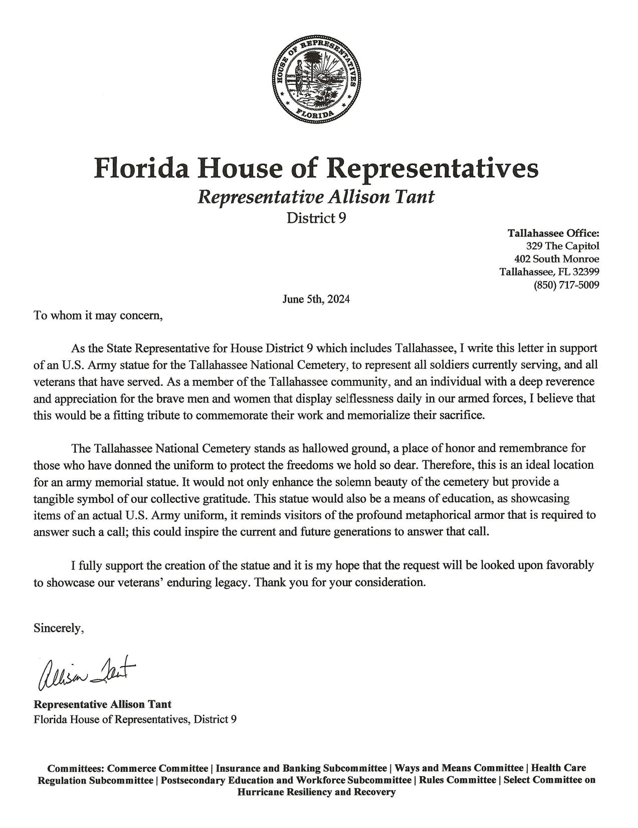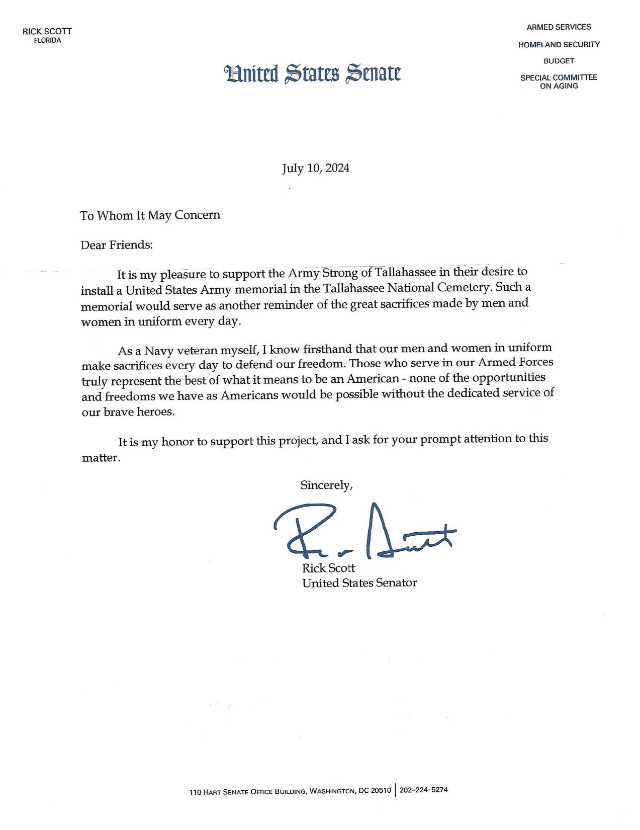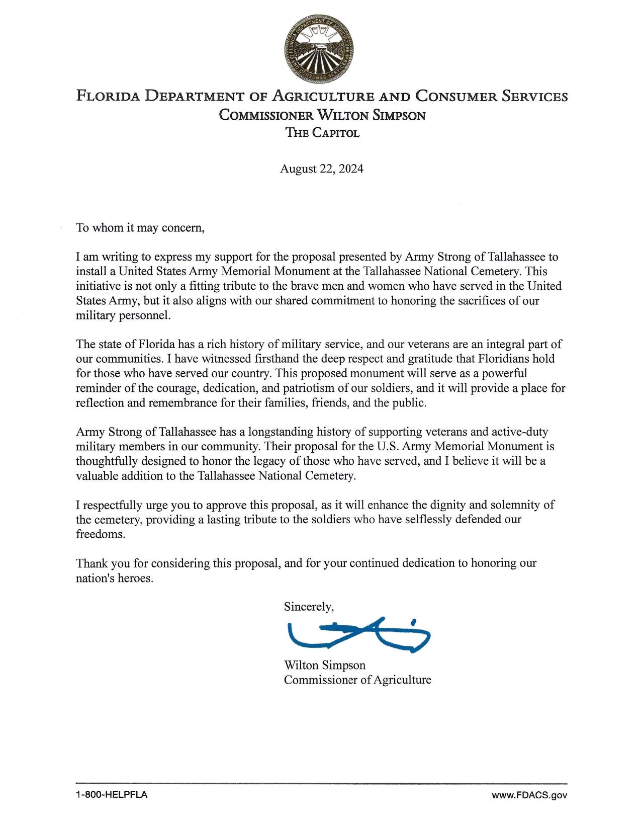 Billy Holder, Chairman, Army Strong of Tallahassee Committee. He submitted a notebook of paperwork to the Director of the National Cemetery for the building of a US Army monument at the Tallahassee National Cemetery. Five or six letters of support were included; the notebook will be forwarded to the VA in Atlanta and if approved from there to DC. DOD has approved the use of the Army seal on the monument and on the small duplicate of the memorial. Donations are needed. Any money left over will go to local veteran associations.
