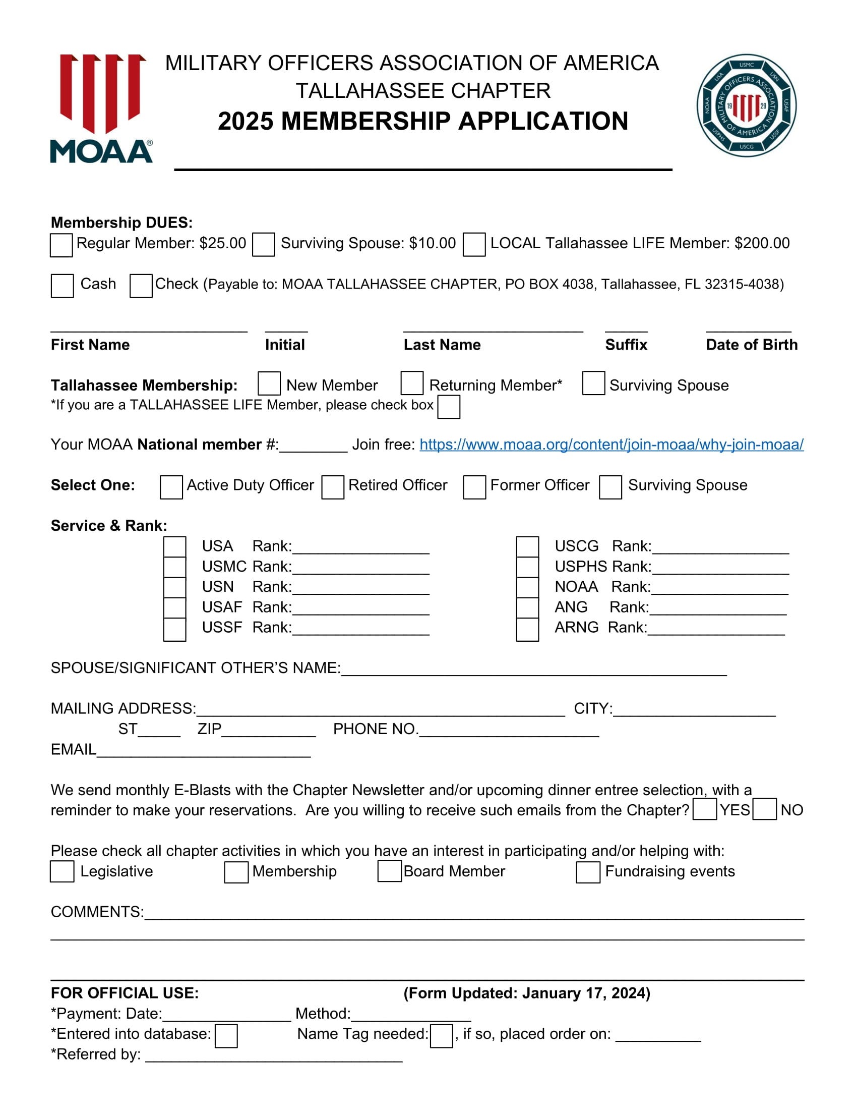 We are kicking off our 2025 Membership drive at the February dinner. I hope you will join or renew your membership with us again this year. We offer annual memberships for $25 and lifetime memberships for $200. Surviving Spouse memberships are $10. The Chapter will comp the first year of membership for first time, new members. The application form is attached, please fill it out and mail it to us (PO Box 4038, Tallahassee, FL 32315) or bring your completed form to the February dinner. MOAA National is in the final stages of deploying an online renewal option, but it may not be fully available by then. Once it is, we'll initially use it for chapter dues but it will be expanded to include dinner RSVPs as the platform matures.