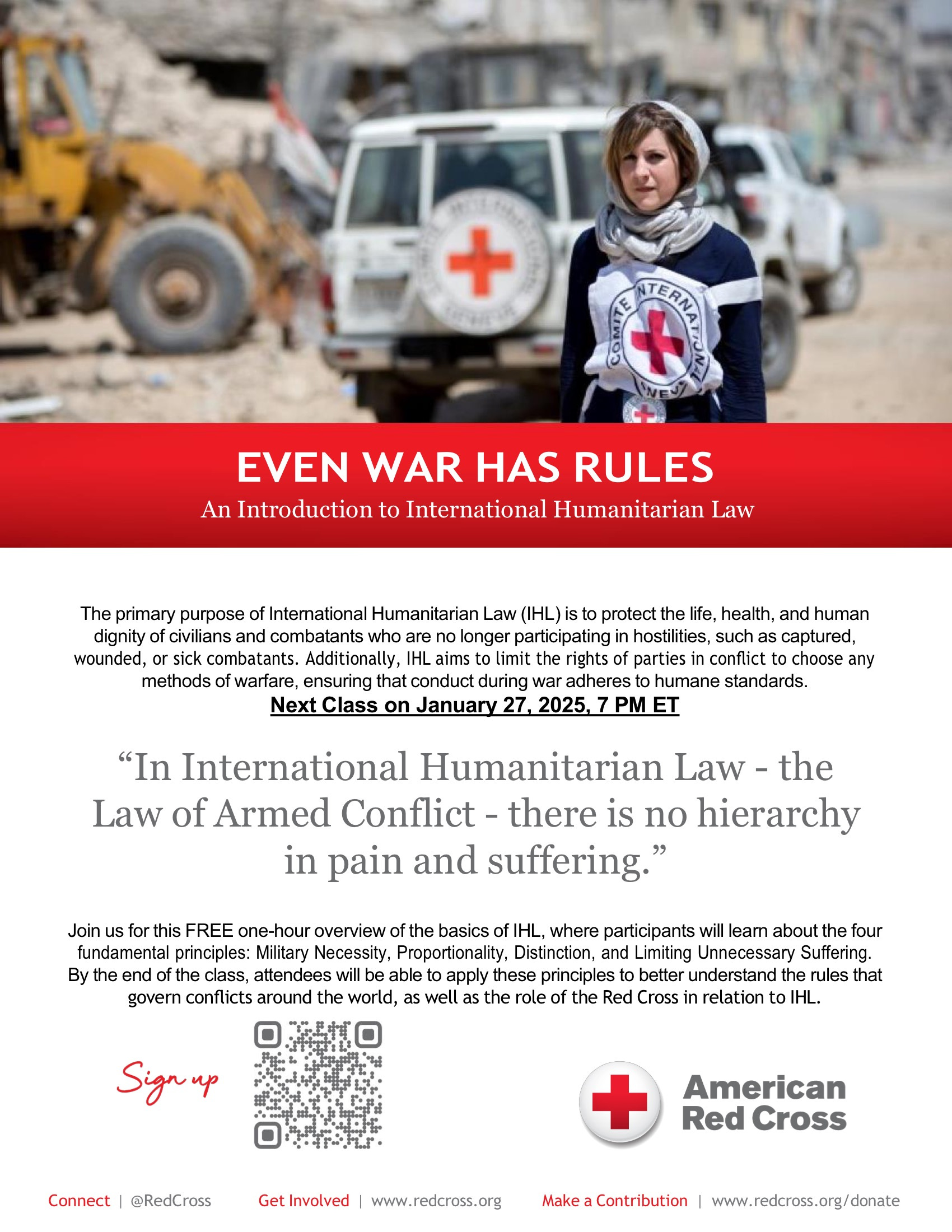 For those with interest, please see the attached Red Cross flyer on an Introduction to International Humanitarian Law being provided on January 27th.