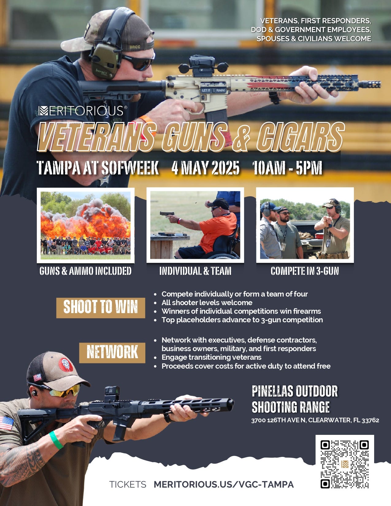 We are once again kicking off SOF Week with our second annual Veterans, Guns & Cigars on Sunday, May 4, 2025, at a new venue just 30 minutes from downtown Tampa in Clearwater. This event merges networking and marksmanship with defense leaders, SOF operators, law enforcement, government contractors, business owners, and veteran nonprofits in attendance. Winners take home the firearms and optics we shoot with, courtesy of long time supporters Ruger and Aimpoint.