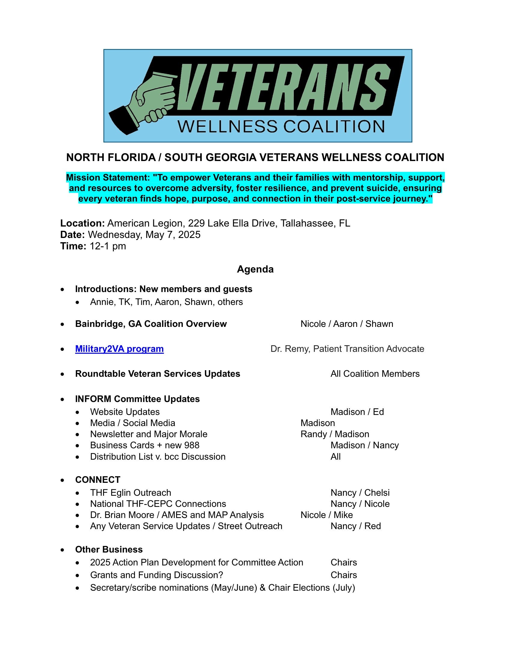 volunteer Veteran Mentor for one or more of the Vets in the program. You