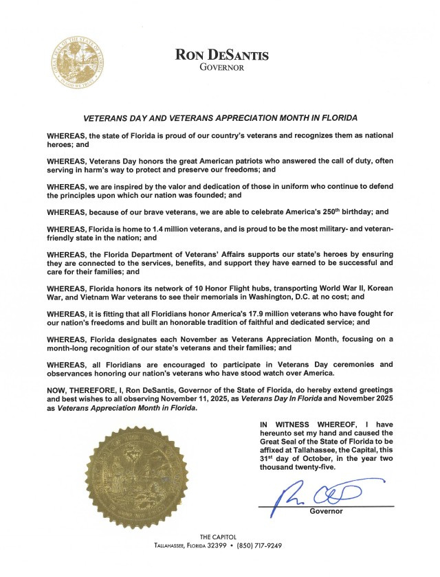Gov. Ron DeSantis has signed the annual Veterans Day and Veterans Appreciation Month in Florida proclamation. Florida is home to nearly 1.4 million veterans, and is proud to be the most military- and veteran-friendly state in the nation.